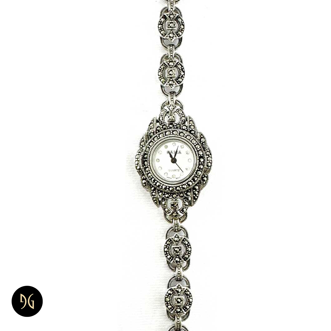 این ساعت با طراحی هنری سیاه قلم و نگین های درخشان مارکازیت، جلوه ای از زیبایی کلاسیک و مدرن را هم زمان به نمایش می گذارد.