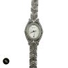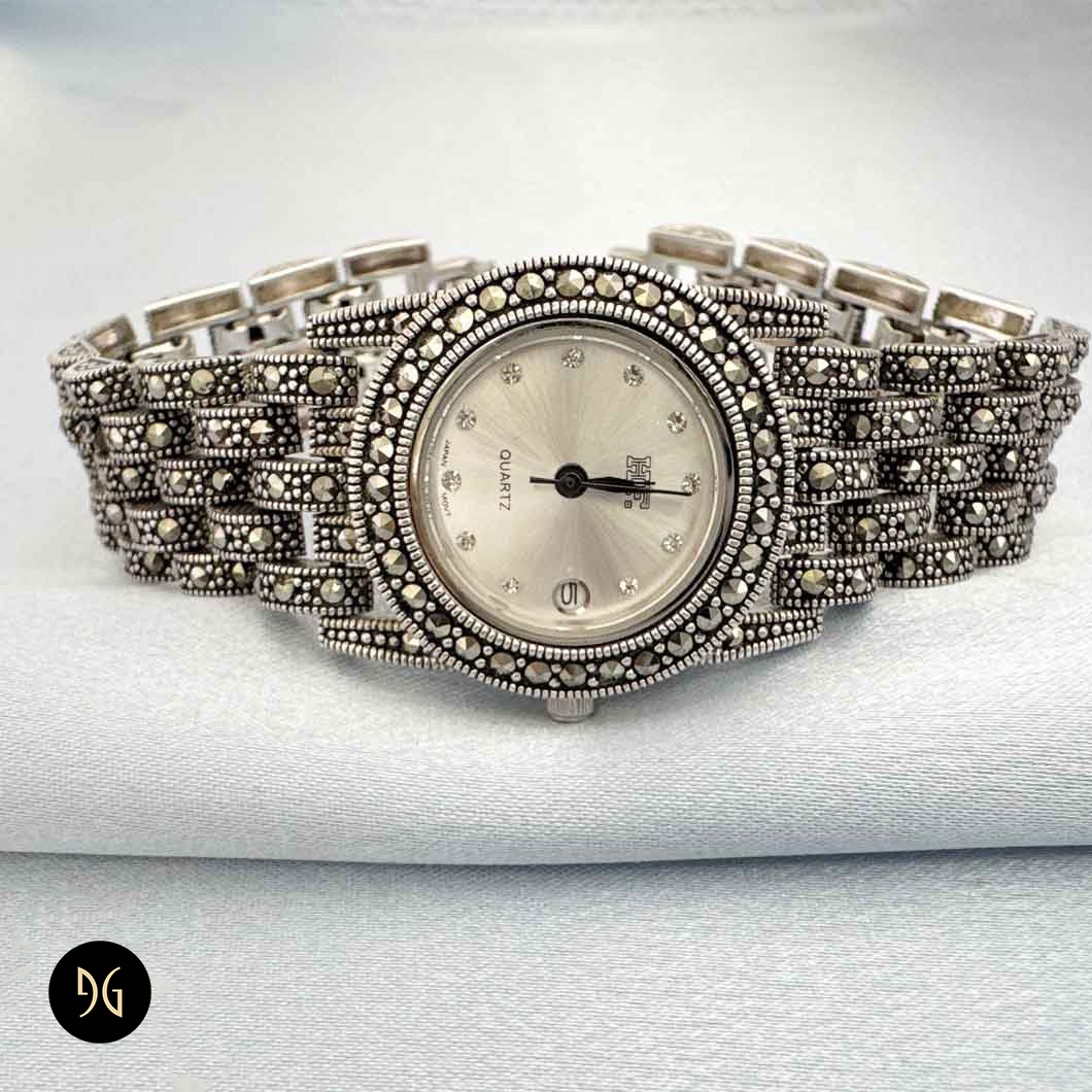 نگین های ظریف مارکازیت که سراسر قاب و بند ساعت را پوشانده اند، زیبایی و درخشش خاصی ایجاد کرده اند.